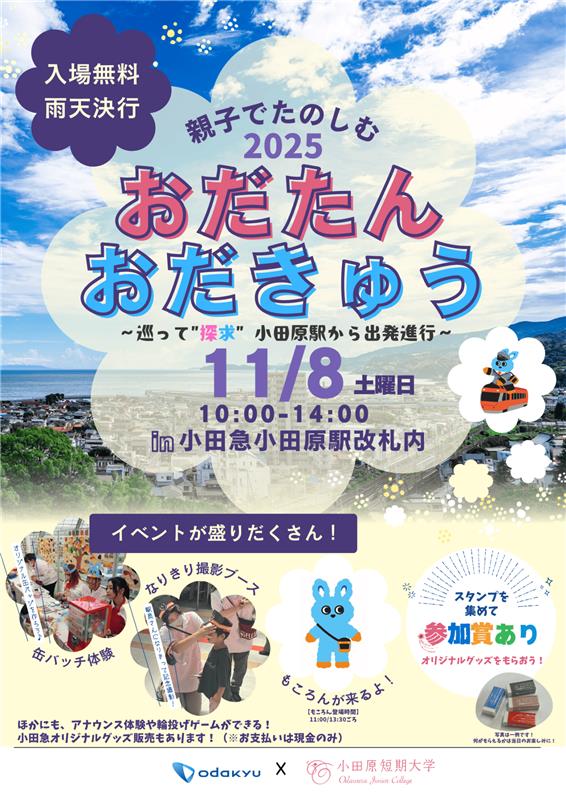≪親子に楽しんでいただく企画・運営を大学を越えたフィールドで体験≫ 本学の最寄駅である小田原駅の小田急電鉄様と協力をし、 親子で楽しめるイベントの開催しました! ※イベントの様子 本学は地域連携プログラムに力を入れています。 地域の方々と様々なふれあいが教室だけでは学べない現場で活きる実践力を磨きます!